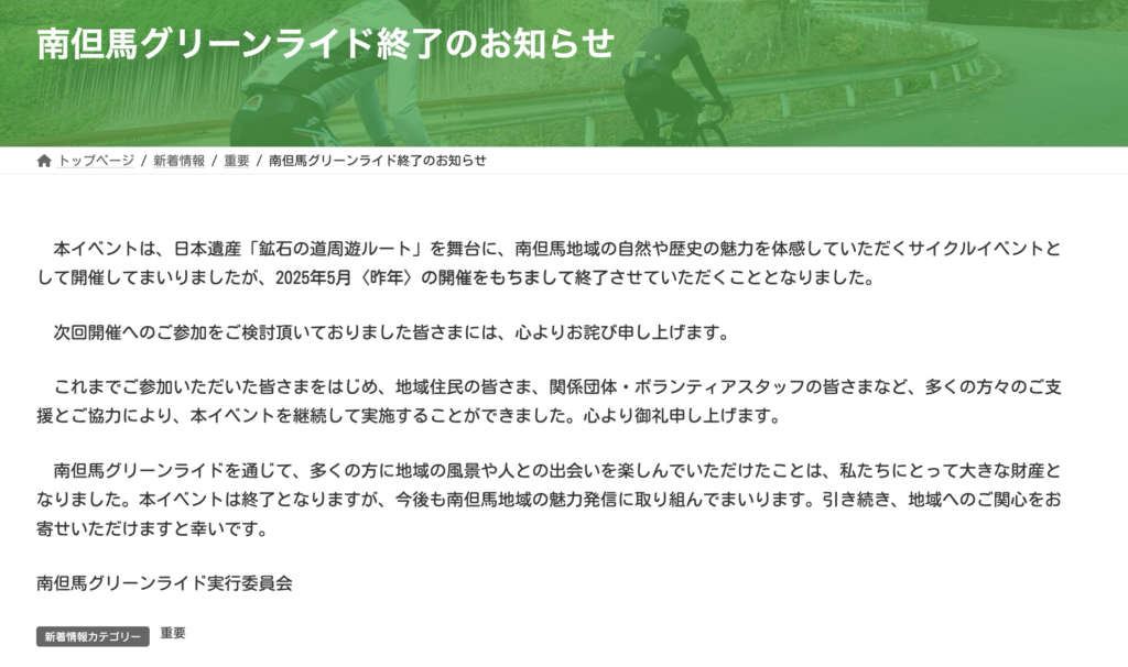 近隣で同時期に開催されていた南但馬グリーンライドが、2025年をもって終了した。