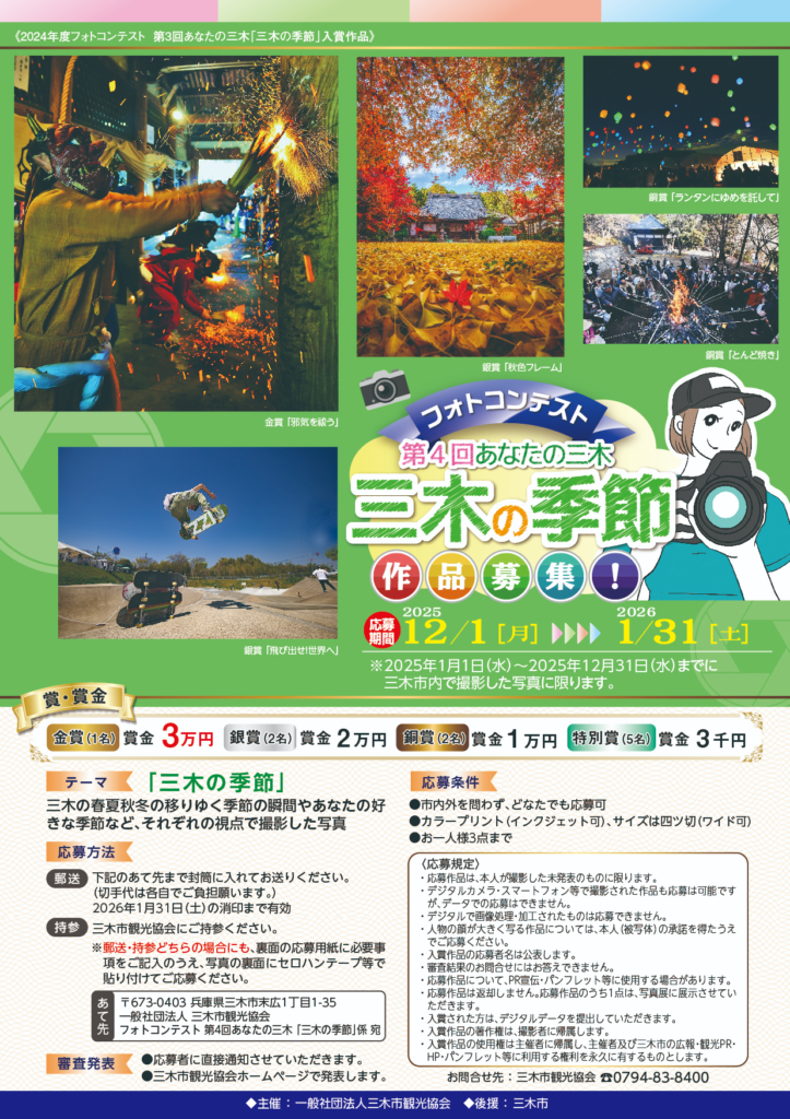 現在、**第4回フォトコンテスト あなたの三木「三木の季節」**の作品を募集中です。