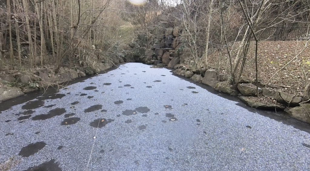 道中、ふと横を見ると池がカチカチに凍りついていました。 かつて、追っ手の足音に怯えながら皇子たちがこの地で過ごした1600年前。この厳しい寒さの中で何を思い、どのような夜を明かしたのか……凍った池を目の当たりにすると、その過酷さがリアリティを持って肌に伝わってきます。