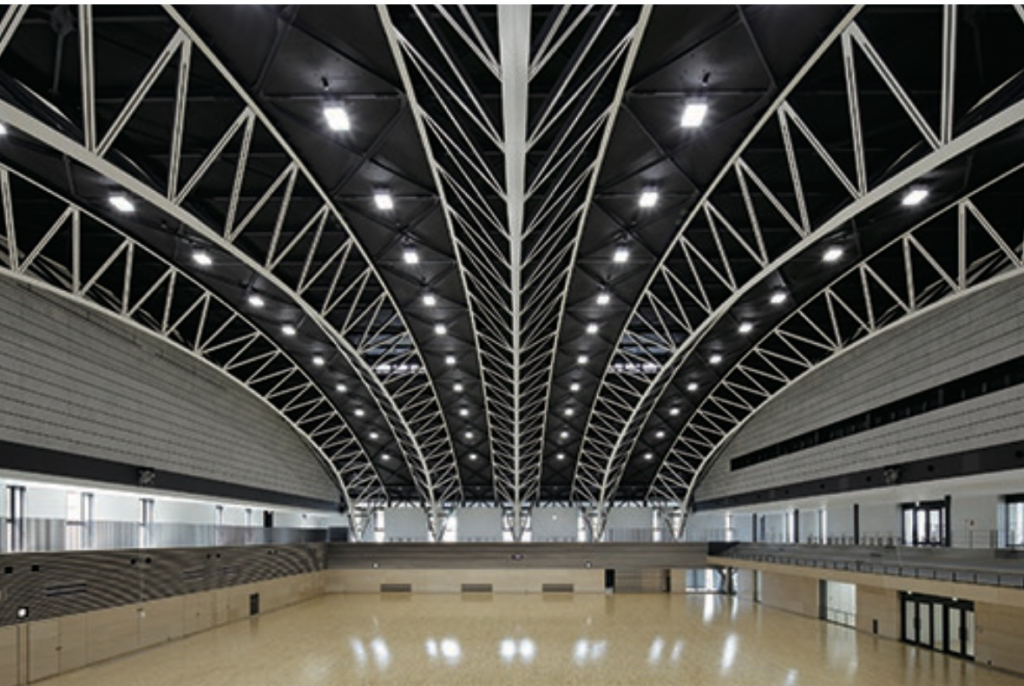 - 白と黒のコントラスト:下弦材を白、側面を黒く塗り分けることで、アリーナに浮き上がるような軽やかさと、金属特有の質感を表現しています。